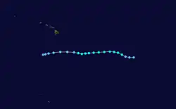 An area of disturbed weather within the ITCZ developed into Tropical Storm Susan around 00:00 UTC on October 18.[7] The storm intensified over subsequent days, becoming a hurricane around 00:00 UTC on October 20 and further developing into a major hurricane by 18:00 UTC the next day. Susan attained Category 4 strength with winds of 130 mph (210 km/h) six hours later,[6] one of the strongest on record in the Central Pacific at that time. Although the powerful hurricane initially tracked northwest toward Hawaii, it sharply veered toward the southwest while succumbing to strong wind shear.[7] Susan weakened rapidly, with winds falling from 115 to 35 mph (185 to 56 km/h) within 24 hours, and dissipated after 00:00 UTC on October 24.[6]