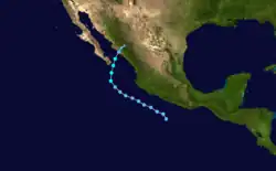 An area of disturbed weather and associated tropical wave was observed east of Acapulco on July 3.[4] It moved southwest during the early stages of its existence before curving more toward the northwest. Satellite imagery identified the existence of a tropical depression by 18:00 UTC on July 6,[5] and that depression quickly intensified into Tropical Storm Emilia six hours later. The newly named storm gathered strength over subsequent days, attaining peak winds of 65 mph (105 km/h) around 06:00 UTC on July 9.[6] Beyond that time, Emilia crossed into cooler waters and began to rapidly weaken,[5] dissipating after 18:00 UTC on July 10.[6]