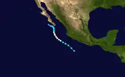 On August 29, a tropical wave and attendant disturbance were located southwest of Acapulco.[4][5] The system organized into a tropical depression by 18:00 UTC on August 30, and it became Tropical Storm Norman six hours later. Norman moved west-northwest while gaining strength,[6] intensifying into a hurricane around 06:00 UTC on September 1 and developing a small eye shortly thereafter. The hurricane rapidly intensified over warm waters,[5] catapulting to Category 4 intensity by 06:00 UTC on September 2. Norman peaked with winds of 140 mph (230 km/h) twelve hours later, equaling Fico and Hector as the strongest storm of the 1978 season.[6] A reconnaissance aircraft in the cyclone at this time observed a 45 mi (72 km) diameter eye.[5] High pressure steering the storm west-northwest gave way to strong southwesterly flow aloft, causing the storm to recurve northeast in a much less favorable environment. Subsequent recon missions found a much weakened cyclone,[5] and Norman ultimately dissipated south of San Clemente Island after 00:00 UTC on September 7.[6]