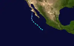 Tropical Storm Paul, the second system alongside Hurricane John without any genesis ties to the Atlantic,[4] was first identified north of Hurricane Olivia on September 22.[5] The system developed into a tropical depression by 00:00 UTC on September 23 but failed to intensify for several days thereafter. Finally, by 12:00 UTC on September 25, the system organized into Tropical Storm Paul.[6] It attained peak winds of 45 mph (72 km/h) six hours later as it curved toward the northeast, narrowly missing Baja California Sur.[5] Paul began to weaken as it approached the Mexico coastline, which it struck as a tropical depression around 12:00 UTC on September 26.[5] Six hours later, the depression transitioned into an extratropical cyclone,[6] which only persisted for an additional six hours before dissipating over northern Mexico.[5]