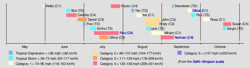 | Gilma | July 13–20 | Category 3 hurricane | 115 (185) | Unknown | None | None | None | [5] | ||