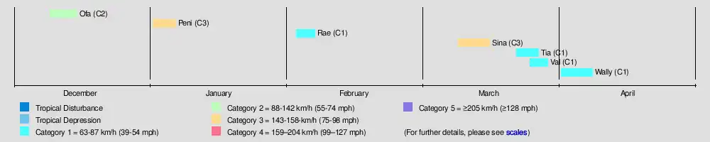 | Sina | March 11 - 16 | Category 3 severe tropical cyclone | 120 km/h (75 mph) | 970 hPa (28.64 inHg) | New Caledonia, New Zealand | |||