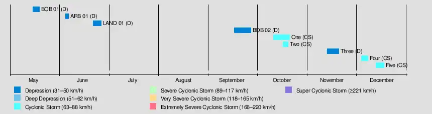 There were 14 depressions during the season. The first depression lasted from May 15–19, moving from the central Bay of Bengal eastward to the Nicobar Islands. The second depression existed from June 4–6 off the west coast of India. On June 21, a land depression developed over central India, moving offshore into the Arabian Sea and dissipating on June 26. There were three land depressions in August, as well as one in September. Another depression developed in the northern Bay of Bengal on September 16 and moved northwestward through India, dissipating on September 26. Another depression developed in the Bay of Bengal on October 1, striking Bangladesh three days later. On October 14, a depression developed in the central Arabian Sea and moved westward, passing near Socotra on October 17; it moved into the Gulf of Aden a day later.[3]
