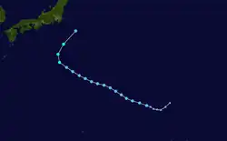 On 24 July, a tropical disturbance which had recently spawned from a tropical upper tropospheric trough (TUTT) began developing.[31] Steadily tracking westward, two days later, the JMA designated the system as a tropical depression.[7] A few hours later, the JTWC issued a TCFA on the system as it steadily developed.[31] As the depression's satellite signature improved, the JTWC issued their first warning on it early the next day.[31] Twelve hours later, both the JTWC and JMA upgraded the system into a tropical storm, with the former agency naming it Lex.[7][31] Tracking northwestward and steadily intensifying, on July 31, both agencies upgraded Lex into a typhoon.[7][31] Soon after, Lex executed a cyclonic loop, later peaking with 1-minute sustained winds of 90 mph; 150 km/h (80 kn)[31] and 10-minute sustained winds of 85 mph; 140 km/h (75 kn) according to the JMA.[7] However, soon after, cold air from a deep surface low caused Lex to steadily weaken.[31] As a result, on 7 August, Lex transitioned into an extratropical low according to the JTWC.[31] The JMA kept monitoring Lex until 13 August.[7]
