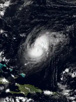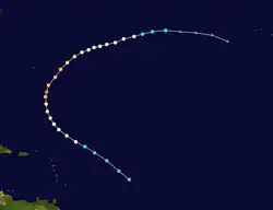 A tropical wave exited western Africa on September 1, gradually developing a concentrated area of convection. Early on September 7, satellite imagery indicated that Tropical Depression Eleven formed about 400 mi (645 km) east of the Leeward Islands. The depression intensified into Tropical Storm Gert on the following day. The newly upgraded storm passed between Dominica and Guadeloupe and continued to intensify, making landfall on southeastern Puerto Rico with winds of 60 mph (97 km/h) late on September 8. After emerging into the Atlantic, Gert weakened while passing just north of the Dominican Republic.[15] It restrengthened while turning northward near the Bahamas, becoming a hurricane on September 10. Midday on September 11, Gert peaked with winds of 105 mph (169 km/h) and a minimum pressure of 988 mbar (988 hPa; 29.2 inHg). The hurricane turned northeastward and weakened over cooler waters, passing about 100 mi (160 km) north of Bermuda on September 12 as a tropical storm. On September 14, Gert weakened further to tropical depression status, dissipating the next day.[16]