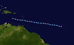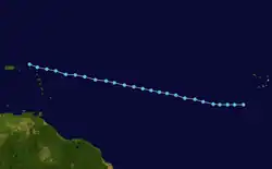 An area of disturbed weather organized into a tropical depression southwest of the Cape Verde Islands on July 27.[8][14] The depression moved generally west-northwestward across the deep Atlantic for several days,[8] but failed to strengthened significantly due to strong upper-level wind shear.[15] The depression dissipated near the northern Leeward Islands on August 2.[8]