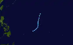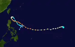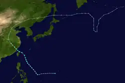 Development of this system was slow within the eastern portion of the monsoon trough. By midday on July 2, the disturbance was first noted about 1,020 kilometres (630 mi) southwest of Guam. The system moved northwest for much of its life cycle, initially following Alex and then the southwest side of the subtropical ridge. A broad tropical depression formed on the afternoon on July 5 within the disturbed weather area, weakening as it passed over Luzon. Late on July 7, ship reports indicated the system had become a tropical storm. The cyclone moved within the radar fence of Hong Kong near its peak intensity before making landfall 250 kilometres (160 mi) to its west-southwest during the early afternoon of July 9. Winds gusted to 70 knots (130 km/h) at Green Island.[1] Weakening over the topography of China was rapid thereafter, and the system dissipated by early on July 10.[6]