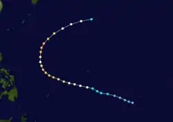 For two weeks after Betty and Cary, a high pressure dominated the northwest Pacific, with no sign of a monsoon trough. A cold front dropped into the area from the north, and remained stationary across much of the central North Pacific just north of Wake Island for nearly a week. An area of convection along the tail of the old frontal boundary formed on July 21, and closed off a wind circulation just northwest of Wake Island. Drifting westward, the system did not develop considerably until July 23. By late on July 24, it became a tropical depression. Intensifying while moving west-southwest, the system became a typhoon late on July 25 with a 55 kilometres (34 mi) wide eye.[8]