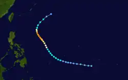 Initiated by the tropical tropospheric trough (TUTT), an area of convection was first noted southeast of the upper trough in an area with favorable upper level divergence on July 2 near 18N 168E. The disturbance moved west-southwest and evolved into a tropical depression late on July 6 and a tropical storm soon after. The cyclone moved northwest towards a break in the subtropical ridge and reached typhoon status late on July 9 forming a large eye about 55 kilometres (34 mi) in diameter. Rapid development continued for another 12 hours as it slowly moved through the ridge axis. The cyclone turned northeast late on July 10 as it began to be sheared significantly from the northwest. Shearing relented on July 11 allowing the eye to reform, this time 75 kilometres (47 mi) wide. As the typhoon progressed more poleward, increased vertical wind shear and the entrainment of cooler and drier air began its extratropical transition. By late on July 14, Cary had become an extratropical cyclone. The nontropical system then moved westward, eventually dissipating south of Japan.[7]