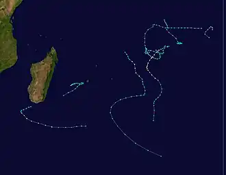 During the season, the Météo-France office (MFR) on Réunion island issued warnings in tropical cyclones within the basin. Using satellite imagery from National Oceanic and Atmospheric Administration, the agency estimated intensity through the Dvorak technique, and warned on tropical cyclones in the region from the coast of Africa to 90° E, south of the equator. The World Meteorological Organization would later label the MFR as a Regional Specialized Meteorological Center in 1993.[1] The Joint Typhoon Warning Center (JTWC), which is a joint United States Navy – United States Air Force task force, also issued tropical cyclone warnings for the southwestern Indian Ocean.[2] The season's five named storms and one tropical cyclone – a storm attaining maximum sustained winds of at least 120 km/h (75 mph) – were both below the average of nine and five, respectively.[3] The MFR considered the tropical cyclone year to begin on August 1 and continue to July 31 of the following year.[1] There was an ongoing El Niño by December,[4] and by January, the monsoon was weaker than normal across the region.[5] This caused below normal thunderstorm activity in February.[6]