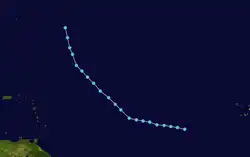 First spotted as a tropical disturbance near the Lesser Antilles on November 15, the system moved generally northward while slowly developing. The system organized into a tropical depression on November 18 and quickly strengthened into a tropical storm. The storm curved northeast and strengthened further, reaching hurricane strength on November 20. However, a surface high-pressure system to the north caused the storm to weaken as the vertical wind shear increased over its center. Frances was later absorbed by an extratropical cyclone on November 21.[38]