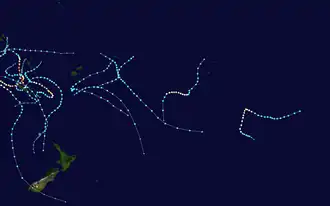 On January 1, Tropical Cyclone Delilah moved into the South Pacific basin from the Australian region, as a category 1 tropical cyclone on the Australian scale.[8] During that day as the system continued to intensify and move south-eastwards towards New Caledonia and the Loyalty Islands, the JTWC initiated advisories on the system and designated it as Tropical Cyclone 04P.[9][10] During January 2, as the system passed about 20–30 mi (30–50 km) of the northeastern coast of New Caledonia, the JTWC and the FMS reported that the system had peaked with sustained windspeeds of 110 km/h (70 mph).[8][10] During the next day Delilah started to weaken and transition into an extra tropical cyclone, as vertical wind shear over the system increased and the upper level westerlies intensified.[1][9] The system subsequently became an extra tropical cyclone during January 4, and started moving southwards towards New Zealand.[1] The system subsequently passed close to northern New Zealand during January 7, before it merged with a cold front during January 8.[1][9]