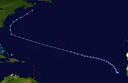 A well-organized disturbance moved off the African coast on September 6 and rapidly developed into Tropical Depression Eleven. The NHC began issuing advisories on September 8 while it was 350 mi (560 km) northeast of Cape Verde. An after-the-fact review of satellite and ship reports indicated that the depression reached tropical storm-strength on September 7.[44][45] However, because of its extreme eastern track, the storm's observational track did not include this information.
