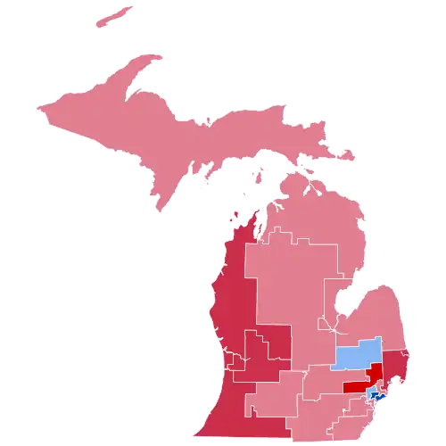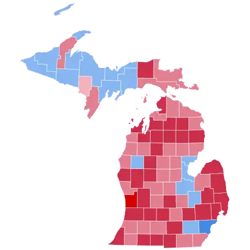 As of the 2024, this is the last election in which Ingham County and Kalamazoo County voted for a Republican presidential candidate, and also the last election in which Michigan was the most Republican-leaning of the three Rust Belt swing states, the others being Wisconsin and Pennsylvania).[2] This was the last time until 2016 that Isabella County voted Republican.[3] This was also the last time, until 2024, that Michigan voted to the right of neighboring Wisconsin, that Muskegon County voted Republican, and that the Lower Peninsula voted Republican.