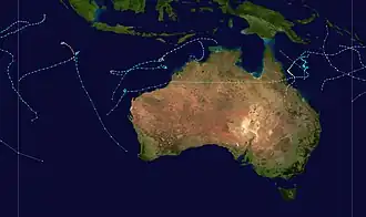 During March, 3 significant tropical lows including 15 and 16P were observed within the Coral Sea/Australian region, which did not become tropical cyclones on the Australian scale but were subject to gale warnings.[12] 15P was first noted on 3 March, while it was located about 900 km (560 mi) to the east of the Solomon Islands.[13] Over the next couple of days the system moved towards the south-west, before it moved into the Australian region during 5 March.[13] The system was subsequently designated as Tropical Cyclone 15P by the JTWC who issued two advisories on it, before it was last noted during the next day while it was located about 500 km (310 mi) to the northeast of Mackay, Australia.[3][13] 16P was first noted within the Australian region on 14 March, while located about 300 km (185 mi) to the southeast of Honiara in the Solomon Islands.[14] Over the next couple of days the system moved towards the south-east before the JTWC designated the system 16P, and initiated advisories on it during 18 March after it had moved into the South Pacific basin.[3] Over the next couple of days the system moved towards the south-southeast before it turned towards the southwest and passed over New Caledonia on 20 March, before it was last noted during the next day as it moved back into the Australian region.[14]