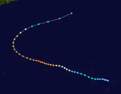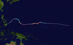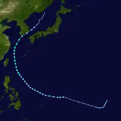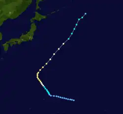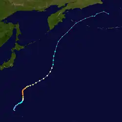 Super Typhoon Page formed on November 21 as a tropical depression. From there, it tracked slowly westward, making a cyclonic loop. Page continued westward, and strengthened into a Category 5 typhoon. It then accelerated northeastward, making landfall in Japan on November 30 as a Category 1 typhoon. Page dissipated over northeast Japan on December 3.[21]