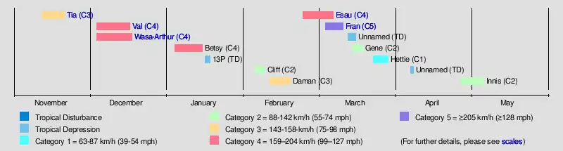 The first tropical cyclone of the season was first noted as a tropical depression on November 13, before it was named Tia during November 16, after it had become a category 1 tropical cyclone on the Australian tropical cyclone intensity scale.[4] Over the next day the system rapidly intensified into a category 3 severe tropical cyclone and affected the Solomon Islands of Tikopia and Anuta while near its peak intensity.[4] Tia subsequently started to weaken during November 19, as it became the first of six tropical cyclones to affect Vanuatu during the season.[1]