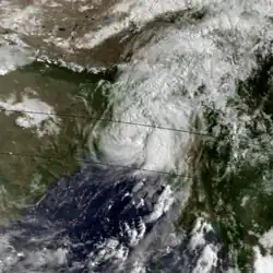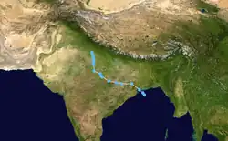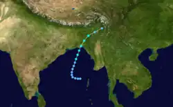 During July 27, a depression developed over the northern Bay of Bengal to the east of the Indian state of Odisha.[2][4] Over the next day the system moved westwards and developed into a Deep Depression, as it made landfall near Badudebpur in Odisha with estimated winds of 55 km/h (35 mph).[4] The system dissipated over East Rajasthan during July 31, as it enhanced monsoon activities over northern and eastern India.[4]