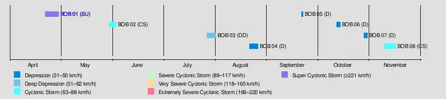 | BOB 01 | April 22–30 | Super Cyclonic Storm | 240 km/h (150 mph) | 920 hPa (27.17 inHg) | India, Bangladesh, Myanmar, Yunnan | $1.5 billion | 138,866 | |