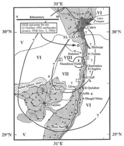 - ^ a b Fergany, Elsayed A.; Sawada, Sumio (1 January 2009). "Estimation of Ground Motion at Damaged Area During 1992 Cairo Earthquake Using Empirical Green's Functions". Seismological Research Letters. 80 (1): 81–88. Bibcode:2009SeiRL..80...81F. doi:10.1785/gssrl.80.1.81. ISSN 0895-0695. Retrieved 9 June 2010.