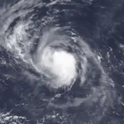 Late on July 15, Hurricane Frank passed about 175 mi (282 km) south of Socorro Island. A station on the island reported winds of 67 mph (108 km/h), which indicated that the hurricane had a large wind field.[42] Slow intensification continued, and Frank intensified into a major hurricane, or a Category 3 on the Saffir-Simpson Hurricane Scale, on July 17.[6] By that time, the eye had become well-defined,[43] and later became surrounded by a ring of deep convection. On July 18, Frank reached its peak intensity of 145 mph (233 km/h) well to the west-southwest of the Baja California peninsula.[44] By July 20, winds dropped below major hurricane intensity, and by the evening, Frank was just a Category 1 hurricane.