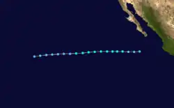 During the season, twenty-seven tropical cyclones formed in the Eastern Pacific (east of longitude 140°W), and twenty-four developed further and became tropical storms. Both of these figures constitute records in the basin, as the 1992 season surpassed the season with the most tropical cyclones (1982, 26) and the season with the most named storms (1985, 22). Of these, fourteen reached hurricane strength and eight became major hurricanes—storms that reach Category 3 or higher on the Saffir-Simpson Hurricane Scale.[5]