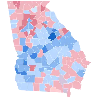 As of the 2020 presidential election, this is the last time that Democrats would carry Pickens, Franklin, Lumpkin, Morgan, Lincoln, Brantley, Bacon, Worth, Bleckley, Monroe, Jeff Davis, Jones, Candler, Haralson, and Laurens counties.[15] Ware County was tied, making this the last time it did not vote Republican, and the last time any county in the United States was tied between the Democratic and Republican parties.[15]
