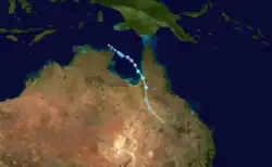 During 29 January, the BoM reported that a tropical low had developed within the monsoon trough, to the north of the Gove Peninsula in the Northern Territory.[7][8] During that day the low rapidly developed further as it moved south-eastwards, before early on 29 January the BoM's TCWC Darwin reported that the low had developed into a category 1 tropical cyclone and named it Sadie as the system started to move southwards.[7] Later that day the JTWC initiated advisories on Cyclone Sadie and designated it as Tropical Cyclone 14P, while the system started to move towards the east and was near its peak 1-minute maximum sustained windspeeds of 85 km/h (50 mph).[7][9][10] Early the next day Cyclone Sadie made landfall to the north of near Normanton, after the BoM had reported that the system had peaked with 10-minute maximum sustained winds of 85 km/h (50 mph).[7][8][10] After making landfall, the system moved towards the south-southeast before weakening and degenerating into a tropical low/rain depression later that day.[7]