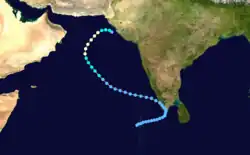 On November 5, the JTWC first monitored an area of convection southwest of India, associated with the Intertropical Convergence Zone. On November 8, the IMD classified the storm as a depression, giving it the identifier ARB 01. The depression moved northeastward toward southern India, moving ashore near Thoothukudi on November 9, and soon degenerated into a remnant low-pressure area. The remnant low of the storm turned back to the northwest and re-emerged into the Arabian Sea. On November 12, it re-intensified into a depression, after convection increased over the center, and the IMD gave the storm a new identifier, ARB 02. Later that day, the JTWC classified the system as Tropical Cyclone 01A. As the storm turned to the north and northeast, it intensified further, based on observations from two ships. The IMD upgraded it to a very severe cyclonic storm on November 14, estimating peak winds of 120 km/h (75 mph). The JTWC estimated higher wind speeds of 150 km/h (95 mph). Wind shear from the westerlies displaced the convection, which continued ahead of the circulation. The center of the storm slowed and turned to the southeast as the winds quickly diminished. By November 16, the system weakened into a remnant low-pressure area off the coast of Gujarat and Sindh.[3][2]