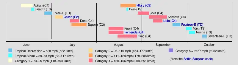 A majority of the season's storms formed from tropical waves between 10°N and southern coast of Mexico. While they generally followed the typical path away from Mexico before dissipating over cooler waters near 25°N, a persistent upper-level trough across the Western United States periodically curved storms into land.[4] Tropical Storm Beatriz produced heavy rainfall and downed trees across Southern Mexico, causing 6 fatalities. In July, Hurricane Calvin struck Southwestern Mexico, prompting the evacuation of 42,000 residents, the displacement of 1,600 people, and 37 deaths. This area was later affected by Hurricane Jova in September, which flooded houses. Hurricanes Dora, Eugene, and Fernanda produced generally minor rainfall across the Hawaiian Islands, alleviating drought conditions. However, their large swells caused damage to beachfront homes and caused the death of a fisherman offshore. Hurricane Hilary produced heavy rainfall across portions of Mexico and California in August. The next month, Hurricane Lidia destroyed hundreds of homes, displaced over 10,000 people, and resulted in 7 deaths.