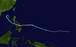 Owen continued to strengthen, with the JMA classifying it a severe tropical storm on April 3.[7] According to the JTWC, Owen reached typhoon intensity at the same time the JMA classified it a severe tropical storm. The storm tracked southwest to west-southwestward, and reached its peak intensity of 75 knots (139 km/h) from the JTWC (60 knots (110 km/h) from the JMA) on April 4, shortly before landfall between Leyte and Mindanao.[6] A reading taken late on April 3 at Guiuan on Samar reported sustained winds of 45 knots (83 km/h).[4] It weakened to a tropical storm overland, before it restrengthened slightly after emerging into the South China Sea. A drilling rig reported 50 knots (93 km/h) sustained winds. Soon afterwards, the cyclone dissipated over water northwest of Luzon on April 9.[6]