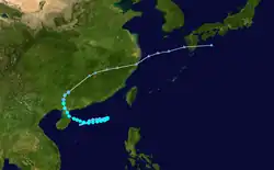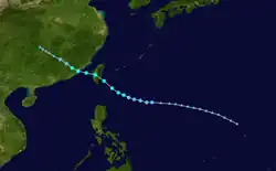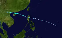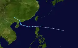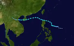 The first warning was issued a day later when the amount of deep convection near the centre increased as the depression neared the Philippines. While over the Philippine islands, a large mesoscale convective system (MCS) developed near the centre of the tropical depression, something that would occur again later while the system was west of Luzon.[15] Soon after the second MCS weakened, the system made landfall in central Vietnam on May 26, and quickly dissipated when inland.[4] The Hong Kong Observatory tracked this system as a weak tropical depression from May 25 UTC when it was about 520 km (320 mi) southeast of Xisha for about 24 hours before it dissipated.[1]
