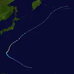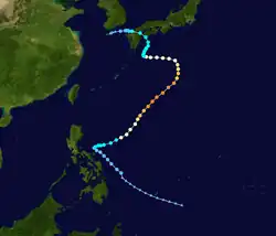 Page moved on a northwestward track for the next couple days while slowly strengthening.[11] Page was upgraded to a tropical storm by the JTWC late on May 12,[12] when it was located 500 kilometres (310 mi) north of Yap,[4] while the JMA first considered the system a tropical storm on May 13.[7] Late on May 13, Page suddenly slowed in forward speed and began turning to the northeast. On May 14, Page became a typhoon.[11][12] However, the JMA did not follow suit until 30 hours later.[7] Page reached its maximum intensity of 90 knots (170 km/h) and minimum pressure of 965 hectopascals (28.5 inHg) thirty hours after passing the point of recurvature.[11] Final warnings were issued by both the JTWC[11] and the JMA[7] early on May 18, as it began extratropical transition around 960 kilometres (600 mi) east-southeast of Tokyo.[11]