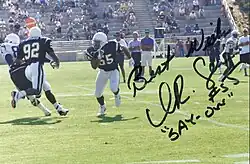 Signed photograph of Junior Seau (#55) at Charger training camp - also pictured are Tony Martin (#81), David Griggs (#92) and Mark Seay (#82)