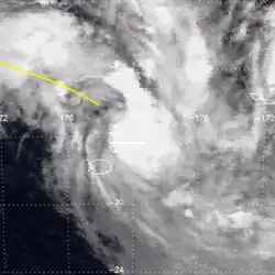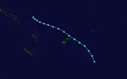 On December 30, the FMS reported that a tropical depression had developed about 860 km (535 mi) to the northeast of Pago Pago in American Samoa.[15] Over the next couple of days, the system moved towards the south-southeast and gradually developed further before the NPMOC designated the depression as Tropical Cyclone 05P.[11][5] During January 1, TCWC Nadi reported that the depression had developed into a Category 1 tropical cyclone and named it William as it passed near the Cook Island of Autitaki.[5] During the next day, William subsequently slowly accelerated as it passed near to or over several other Cook Islands and intensified into a Category 2 tropical cyclone.[5]