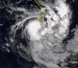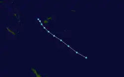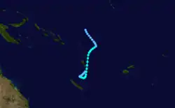 A persistent cloud mass east of the Solomon Islands evolved into a tropical depression on November 12, according to the FMS.[8][4] Located about 245 km (150 mi) northeast of Tikopia, the system had gale-force winds developing on its southern side.[8][9] The depression moved south-eastwards at first, before it turned southwestwards through Temotu Province towards Vanuatu, which prompted the FMS to start issuing special weather bulletins for the island nation during November 13.[8][9][10] Later that day, the JTWC initiated advisories, designating it Tropical Cyclone 01P. On November 14, the FMS named the system Vania, after it had become a category 1 tropical cyclone on the Australian scale.[8][9][11] Intensifying further, Vania moved through northern Vanuatu on November 15 as a category 2 tropical cyclone.[9] Later that day, the FMS predicted that Vania would become a hurricane and issued a hurricane warning; however, Vania had peaked as a category 2 tropical cyclone with peak 10-minute sustained windspeeds of between 100 km/h (65 mph), while the JTWC estimated that the system had peaked with 1-minute sustained windspeeds of 110 km/h (70 mph).[9][11][8] Over the next couple of days, the system stalled and started to move westwards, before the FMS and JTWC issued their final advisories on the cyclone during November 18, as it had weakened below tropical cyclone intensity and degenerated into a sheared depression to the north of New Caledonia.[8][9][11] The remnant low-level circulation was last noted during November 19, while they were located about 80 km (50 mi) to the west of Port Vila.[9]