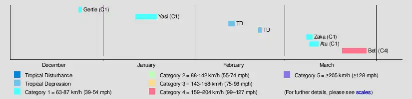 | Beti | March 21 – 28 | Category 4 severe tropical cyclone | 165 km/h (105 mph) | 935 hPa (27.61 inHg) | Australia, Vanuatu New Caledonia, New Zealand |
