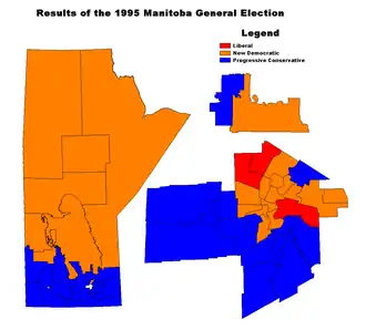 The 1995 Manitoba general election was held on April 25, 1995 to elect Members of the Legislative Assembly of the Province of Manitoba, Canada. Progressive Conservative Party, which won 31 seats out of 57, clinched the elections. The New Democratic Party formed the official opposition with 23 seats; the Liberal Party won 3.