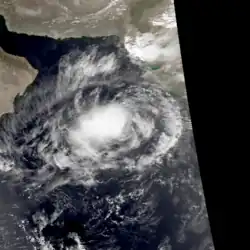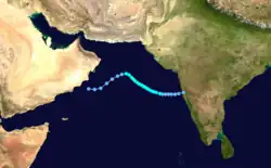 A low-pressure area accompanied by a well-defined circulation persisted over central India on October 11. By the following day, the system emerged into the Arabian Sea, whereupon its convection organized west of a sheared circulation. On October 12, the system organized into a depression, classified Tropical Cyclone 02A by the JTWC. Steered by a ridge, it moved to the west-northwest and gradually intensified. The IMD upgraded it to a cyclonic storm on October 14, estimating peak 3 minute winds of 85 km/h (55 mph). The JTWC assessed slightly higher 1 minute winds of 95 km/h (60 mph). Increased wind shear stripped away the convection, causing the storm to weaken. By October 17, the system deteriorated into a depression and began drifting to the southwest, having moved between two ridges. Later that day, the system degenerated into a remnant low, which the JTWC tracked for an additional day until dissipation east of the Somalia coastline.[2][3]