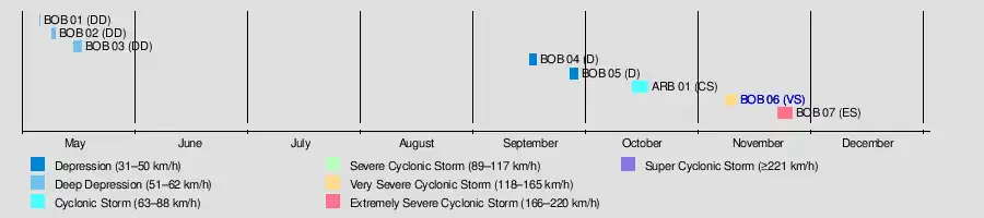 Tropical activity was largely affected by the monsoon trough, which spawned the three deep depressions in May, as well as the two strongest cyclones in November. The first storm of the season formed on May 5 in the Bay of Bengal, the same location as two additional depressions later in the month. Collectively, the three systems killed 146 people, mostly related to the third system which produced a deadly storm surge in Bangladesh. After two weak depressions in September, the season's lone Arabian Sea storm developed on October 12, and remained largely away from land. The final two storms of the season were the most notable. On November 10, a cyclone struck southeastern India, killing 173 people in India and Bangladesh. Its remnants produced a rare snowstorm in eastern Nepal that caused landslides and avalanches, killing 63. The last storm of the season was also the most powerful, causing 172 deaths when it struck southeastern Bangladesh.