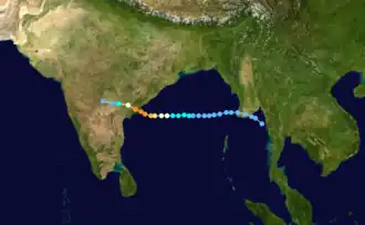 On 30 October, a Pacific tropical depression crossed the Kra Isthmus into the Bay of Bengal, dissipating the next day over Myanmar. A new area of convection, or thunderstorms, developed over the Andaman Sea on 1 November [3] The system was located within the monsoon trough, and a weak flow steered it slowly westward across the Bay of Bengal,[4] bringing it briefly over southwestern Myanmar. After the convection organized more, the Joint Typhoon Warning Center (JTWC) issued a Tropical Cyclone Formation Alert at 07:30 UTC on 3 November. At 12:00 UTC that day, the agency initiated advisories on the system, designating it Tropical Cyclone 07B about 645 km (401 mi) west of Yangon, Myanmar.[3] The India Meteorological Department (IMD) – the official Regional Specialized Meteorological Center for the basin – did not classify the system until 4 November; at 15:00 UTC, the agency designated it as a depression.[5]