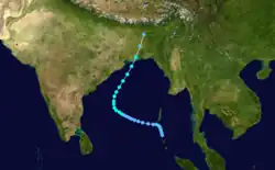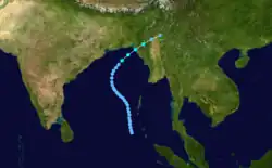 The monsoon trough produced an area of convection south of the Andaman and Nicobar Islands on October 21. Located south of a ridge, the system moved westward through an area of hostile wind shear, which prevented quick development by displacing the circulation east of the convection.[3][6] The JTWC issued a TCFA on October 22 once it appeared the shear was decreasing, although the system did not organize initially. After the convection became more defined, the JTWC classified the system as Tropical Cyclone 06B on October 25 in the central Bay of Bengal.[3] An approaching trough from the west weakened the ridge, allowing the storm to turn to the north and later northeast.[6] The IMD classified the system as a depression on October 27, and later that day estimated peak 3-minute winds of 55 km/h (35 mph), making it a deep depression.[1] The JTWC assessed a higher intensity of 85 km/h (55 mph). Accelerating northeastward, the storm made landfall near the border of India and Bangladesh around 18:00 UTC on October 28.[3] Moving through Bangladesh, the system quickly weakened and degenerated into a remnant low on October 29 over the Indian state of Assam.[1]