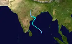 On June 9, a disturbance began forming within the monsoon trough off the southeast coast of India. Inflow from the south helped the system organize,[18] and the convection became more defined on June 11. At 06:00 UTC the next day, the JTWC classified the system as Tropical Cyclone 03B,[3] and three hours later the IMD classified it as a depression.[1] A ridge to the east initially steered the system to the northwest, although an approaching trough turned it to the northeast, parallel to the coastline.[18] Early on June 13, the JTWC assessed peak 1-minute winds of 85 km/h (55 mph),[3] and on the next day, the IMD upgraded the system to a cyclonic storm. Both the intensity and the track were unusual for the month of June. At 00:00 UTC on June 16, the IMD estimated peak 3-minute winds of 85 km/h (55 mph), around which time the storm turned back to the northwest. Five hours later, the storm made landfall near Visakhapatnam, Andhra Pradesh, and it rapidly weakened into a remnant low.[1] The JTWC continued tracking the remnants until June 18 when the system was over Madhya Pradesh.[3]