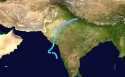 While the previous storm was paralleling the east Indian coastline, another disturbance formed off the west coast on June 15, also associated with the monsoon. The new area of convection persisted,[3] developing a distinct circulation by the next day. Early on June 17, a depression developed about 365 km (227 mi) west of Mumbai.[1] At 18:00 UTC that day, the JTWC classified it as Tropical Cyclone 04A, after the wind field became more defined.[3] The system moved to the northeast within the influence of the monsoon, and quickly intensified due to an anticyclone aloft providing favorable conditions.[1][18] On June 18, the IMD upgraded the system to a cyclonic storm, and further to a severe cyclonic storm by 18:00 UTC that day. At 23:00 UTC, the storm made landfall on Gujarat near Diu, only the fourth cyclone since 1891 to strike the state in June. An hour later the IMD assessed peak 3-minute winds of 110 km/h (70 mph), based on the appearance of an eye feature.[1] Meanwhile, the JTWC assessed slightly stronger 1-minute winds of 120 km/h (75 mph), equivalent to a minimal hurricane.[3] The storm turned northward and slowly weakened, degenerating into a remnant low over Rajasthan on June 20 before being swept up by an approaching trough.[1]