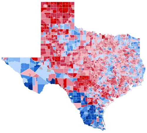 As of the 2024 presidential election, this is the last time a Democratic presidential candidate won the following counties: Hudspeth, Pecos, Terrell, Ward, Swisher, Hall, Cottle, Hardeman, Foard, Baylor, Knox, Haskell, Stonewall, Kent, Dickens, Crosby, Jones, Fisher, Nolan, Mitchell, Menard, Comanche, Palo Pinto, Bastrop, Caldwell, Nueces, San Patricio, Refugio, Bee, Karnes, Atascosa, Burleson, Milam, Falls, Limestone, Navarro, Waller, Grimes, Galveston, Trinity, Orange, Jasper, Tyler, Sabine, San Augustine, Shelby, Panola, Harrison, Marion, Cass, Bowie, Camp, Titus, Red River, Rains, Hopkins, Delta, and Fannin.[4] The 58 counties who have not voted for a Democrat since 1996 are the most from one state in this election -- an election already defined by being the end of white rural Southern support for the Democrats writ large -- and the most from one state since 1976 (also Texas, with 73).