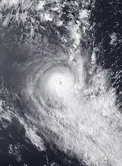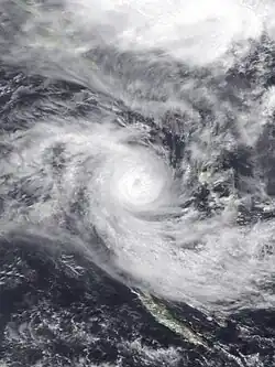 During November 2, the system continued to intensify as it moved towards the southeast and became equivalent to a category 2 hurricane on the SSHWS, as it moved towards the French Polynesian Society Islands of Bellingshausen, Mopelia and Scilly.[1][27] During the next day, Martin passed near the Society Islands as it developed an 17 km (10 mi) eye, before the FMS reported at 06:00 UTC that the system had peaked as a category 3 severe tropical cyclone with 10-minute sustained wind speeds of 155 km/h (100 mph).[1][27][29] The NPMOC also reported at around that time that Martin had peaked with 1-minute sustained windspeeds of 185 km/h (115 mph), which made it equivalent to a category 3 hurricane on the SSHWS.[27][29] After peaking in intensity Martin started to weaken, as it interacted with a frontal system and started to accelerate towards the south-southeast.[9][30] During November 4, Martin passed within 250 km (155 mi) of Tahiti as it became a category 2 tropical cyclone and started to transition into an extratropical cyclone.[9][27][31] Later that day, the NPMOC issued their final advisory on Martin as it had become vertically sheared, with its surface center dislocated about 110 km (70 mi) from its upper level center.[32] During November 5, the system weakened below tropical cyclone intensity as it moved into Met Services's area of responsibility, before it was last noted on November 8.[9][27]