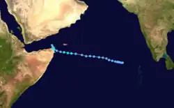 A broad trough of low pressure formed into a tropical depression on November 4 in the central Arabian Sea. It moved westward, slowly intensifying into a tropical storm on the 8th. Vertical shear weakened it to a depression later that day, but on the 9th, just before making landfall on eastern Somalia, it restrengthened to a tropical storm. Tropical Storm Three dissipated on the 10th without causing any reported damage.