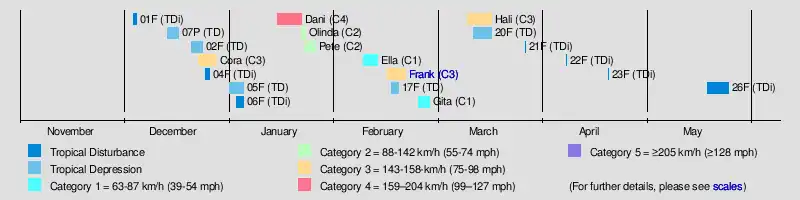 | Frank | February 16–21 | Category 3 severe tropical cyclone | ||||||