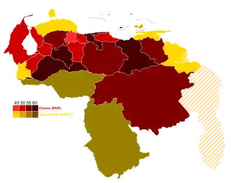 The two traditional main parties hoped that 8 November parliamentary and regional elections would give them a boost, a month ahead of 8 December presidential elections, but the poll remained a two-horse race.[4] At this point polls generally showed Chávez with a 6–12-point lead over Salas Römer's approximately 38% poll numbers, though in some polls he exceeded that margin.[4] Both COPEI and Democratic Action now sought to endorse Salas Römer (he was reluctant to accept). COPEI persuaded its candidate (Sáez) to resign, but Democratic Action's candidate, Alfaro Ucero, refused to do so, triggering an electoral crisis as the National Electoral Council had to rule on whether the Democratic Action ballot slot belonged to the party or the candidate.[4] Salas Römer agreed to accept the endorsement of COPEI and Democratic Action regional and local parties, and sought to maintain a distance to the parties' national leadership.[4] In the end, it was not enough, and Chávez won a substantial majority, and won 17 of 23 states.[4]