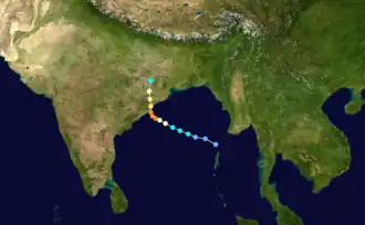 The 1999 East India Cyclone (IMD designated BOB 05,[1] JTWC designated 04B), was the second strongest, deadliest, and costliest cyclone of the 1999 North Indian Ocean cyclone season. On October 15, a developing area of low pressure, located 220 nm northwest of the Andaman Islands began to intensify. By 1730Z a TCFA was issued and the first advisory on Tropical Storm 04B was issued at 2100Z. 04B was moving to the west-northwest at 8–12 knots as it continued to intensify. On October 17, the storm began to turn to a more northerly direction as it intensified to a cyclone. 04B underwent explosive intensification the same day and reached its peak of 140 mph at 0000Z. The storm held this intensity as it made landfall on the Odisha coastline near Gopalpur beach at around 8am.[2] The storm began to weaken due to the interaction with land and dissipated on October 19. 04B was responsible for at least 180 fatalities and hundreds of houses and huts in low-lying areas were destroyed by flooding.[1] Several thousand others were injured by the storm and hundreds were left homeless. The Prime Minister of India requested that relief supplies be distributed to the affected region immediately.[3]